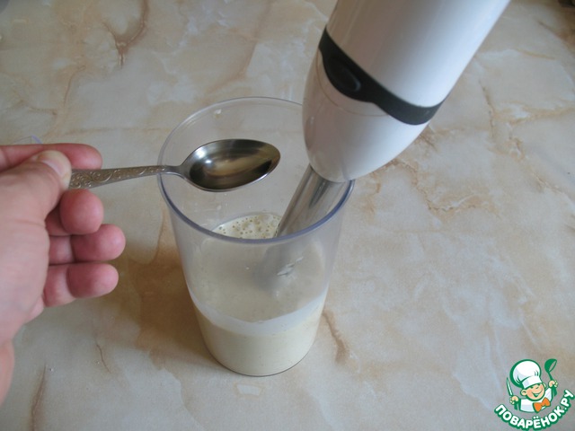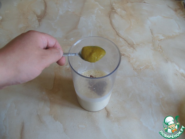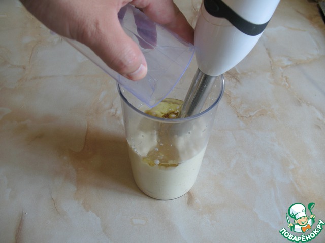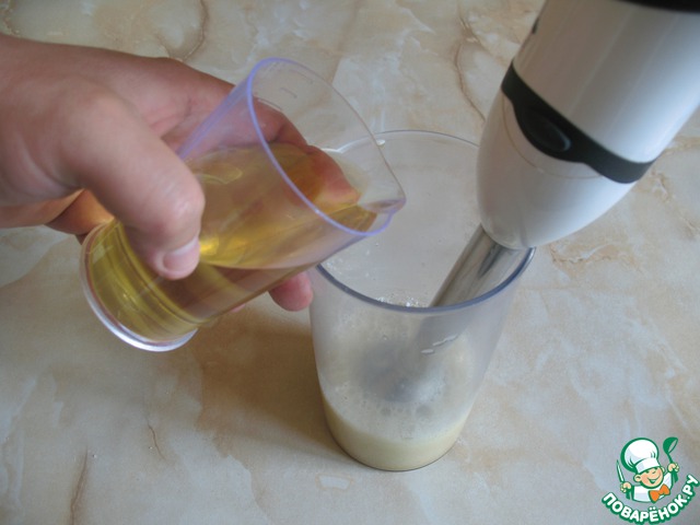 Оставшуюся часть масла медленно вливать в стакан, непрестанно взбивая этот процесс блендером.