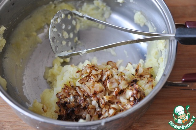 С готового картофеля сливаем отвар, разминаем "толкушкой", добавляем зажаренный лук, перемешиваем. Если пюре получилось сухое, то добавляем немного отвара.
