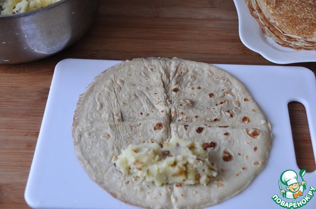 На край блина кладём картофельное пюре и заворачиваем.