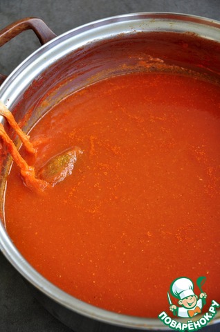 Семечки выбросить. Получится около 3,5-4 литров сока, зависит от сочности помидор. Поставить на сильный огонь, постоянно помешивая, довести до кипения. Варить 2 часа, не накрывая крышкой, пока сок не выпарится до половины.
