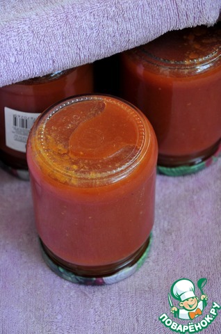 Разлить соус по стерилизованным банкам, закрыть крышкой, закутать в махровое полотенце, поставить вверх дном и оставить так остывать до утра.