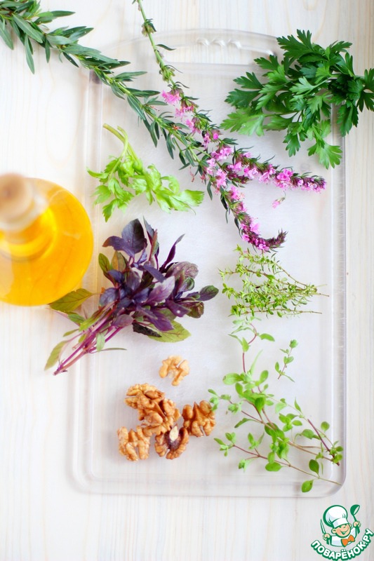 О зелени. В оригинале идёт на 100 г. петрушки и кинзы 100 г. разнотравья: чабрец, анисовый иссоп, базилик, орегано. Я же просто срезаю всё что растёт в огороде, включая любисток, тимьян, укроп. Еще не разу не удавалось испортить чем-то вкус.