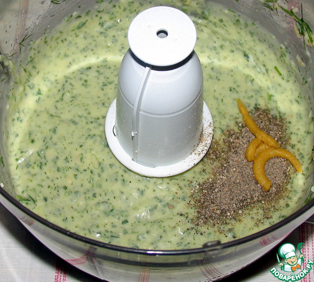 Туда же выложила из баночки сыр (сыр у нас продаётся с разными наполнителями - с грибами, ветчиной, креветками, укропом, луком и др.) Я взяла сыр без добавок. Решила "дип" приготовить с зеленью и немного остренький, т. е. на свой вкус.