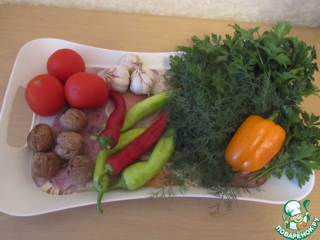 Овощи подготовить к переработке. Орехи очистить от скорлупы, из перца удалить семена и плодоножку, чеснок очистить, зелень порубить, помидоры ошпарить кипятком и очистить от кожуры.