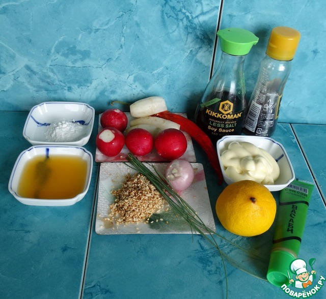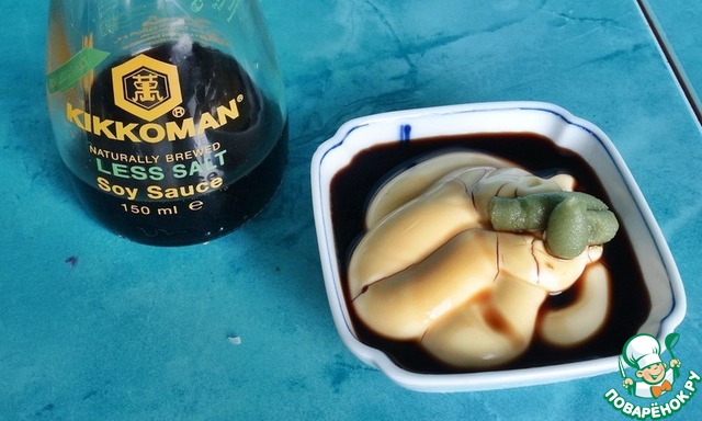 Второй соус попроще в приготовлении, но не менее пикантный на вкус. Возьмём 3 ст. л. лёгкого майонеза, 1\2 ч. л. васаби и 1 ст. л. соевого соуса. Можно добавить 2ст. л. саке или сухого вина. Размешать всё до однородной массы.