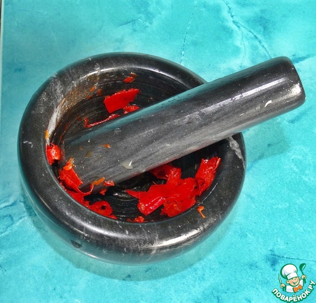 Растереть в ступке сухой стручок перца чили. Думаю, что можно взять щепотку молотого острого перца.