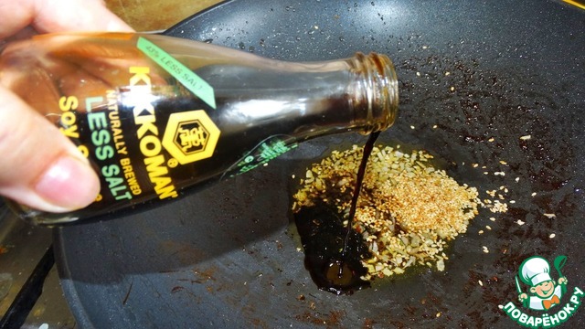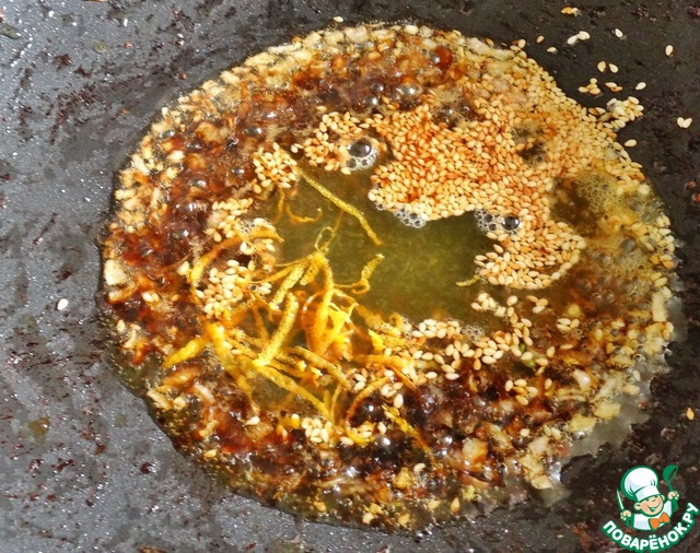 Кунжутное масло разогреть и поджарить на нём измельчённый лук-шалот.