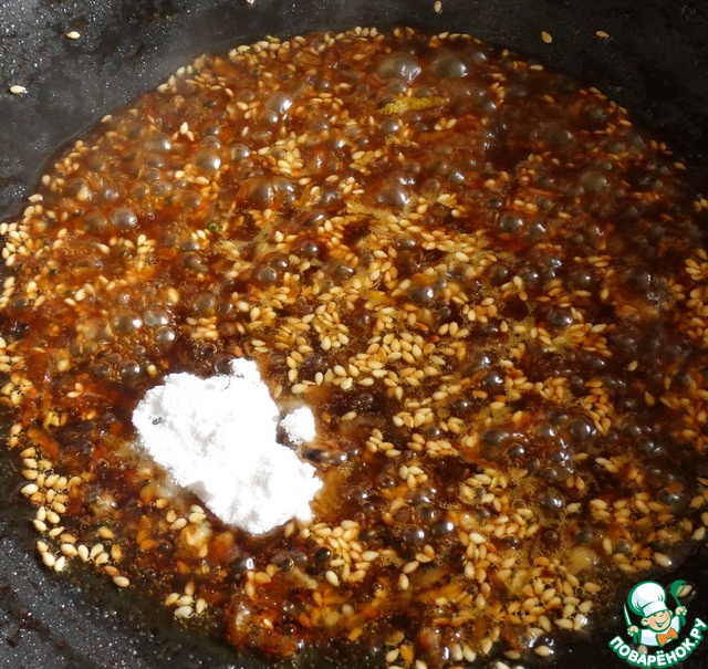 Ввести обжаренные семена кунжута и апельсиновый сок с цедрой апельсина.