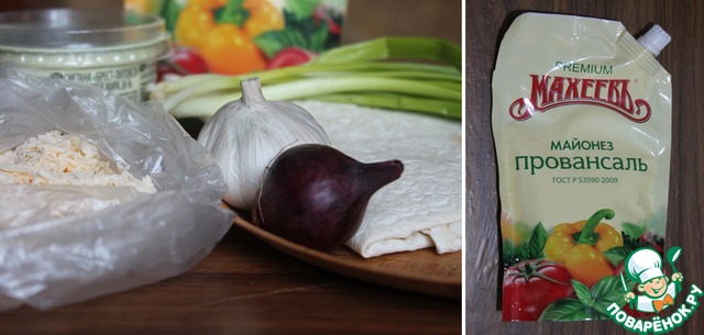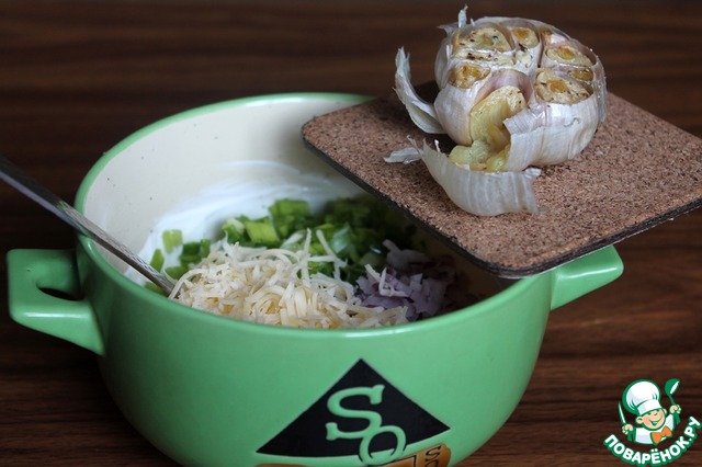 Когда чеснок запечется, приготовим соус. Для этого соединим сметану, майонез, мелко нарезанный зеленый и красный лук, сыр, молотый перец и порубленный или раздавленный вилкой чеснок. Все тщательно перемешать. Соус можете смело регулировать под свой вкус, потому как все мы разные, кто-то любит по-острее, а кто-то по-мягче.