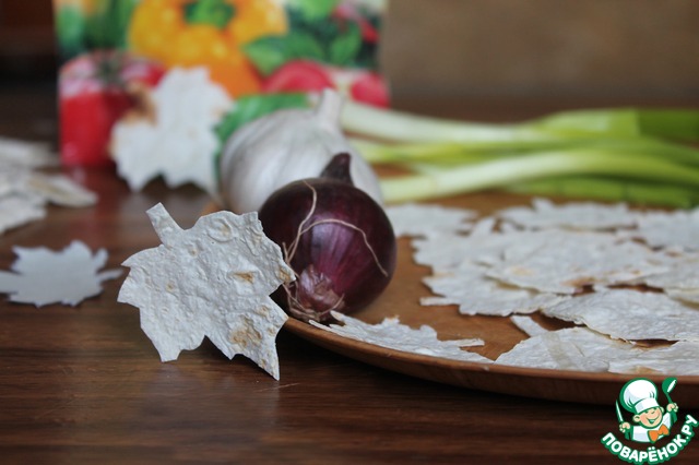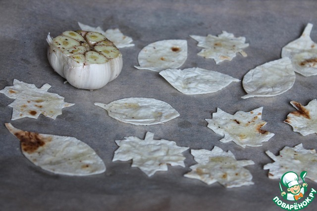 Можно просто порезать лаваш на треугольники, но у меня разыгралась фантазия, и я вырезала кленовые листочки из него) Они такие хорошенькие получились))