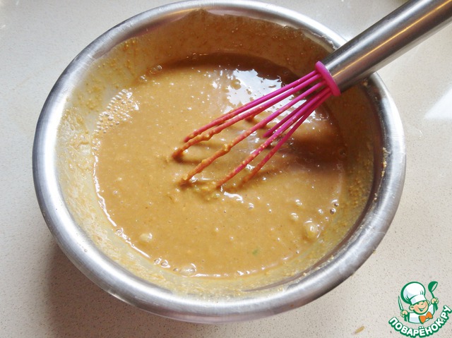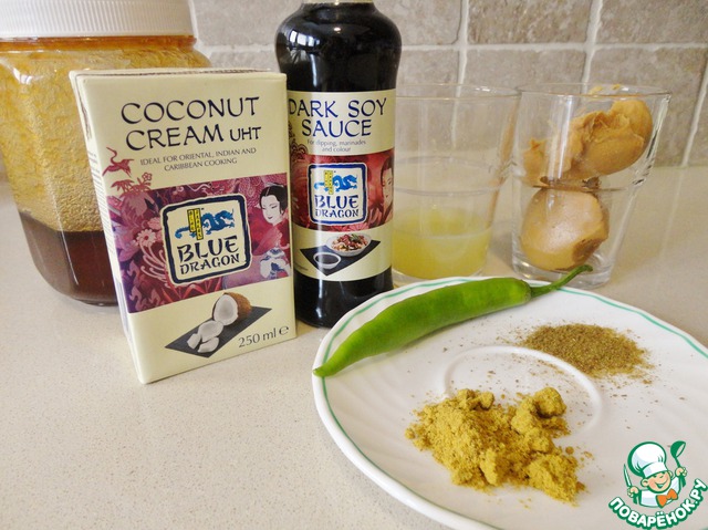 В мисочке хорошенько смешиваем арахисовое масло, сок лимона, кокосовые сливки, мед, карри, соевый соус, тмин и мелко нарезанный жгучий перец.
