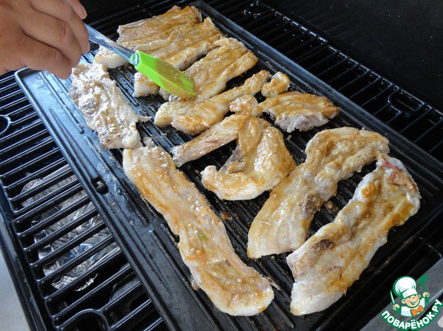 Затем просто, при жарке мяса или птицы на барбекю, периодически обмазываем кусочки подготовленным соусом.
