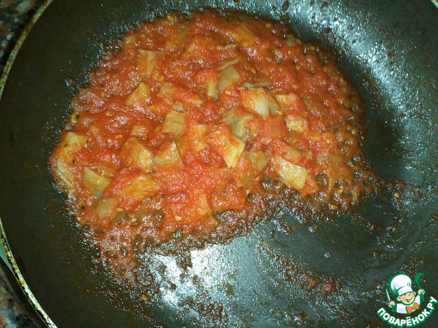 В сковороде разогреваем 1 ст. л. оливкового масла и бросаем туда несколько маленьких кусочков чеснока ( приблизительно половинка зубчика) и обжариваем его в масле пока оно не впитает аромат чеснока ( секунд 10-15), после этого вылавливаем чеснок и выливаем в масло кашицы помидора и лука. Все хорошо перемешиваем и тушим на небольшом огне.
