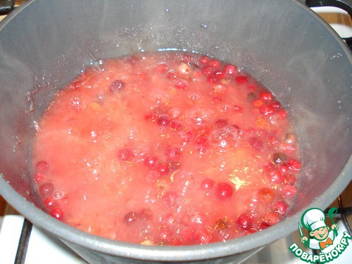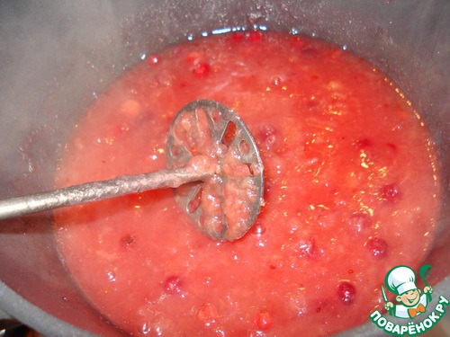 Разомните яблоки и клюкву в пюре с помощью пресса для картофельного пюре.