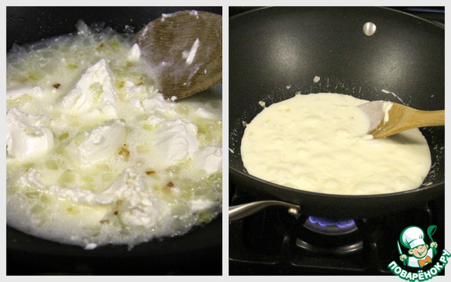 Добавить сливочный сыр, бульон и готовить до однородного состояния.