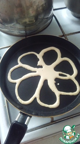 Замесить тесто. Дать настояться минут 30. Затем взять небольшую пластиковую бутылку, в крышке сделать небольшую прорезь и налить часть теста в бутылку. На разогретую сковороду выливать тесто, создавая узоры.
