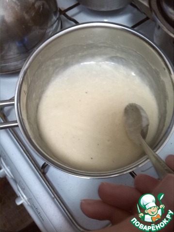 Добавить постепенно бульон (или воду), постоянно помешивая.