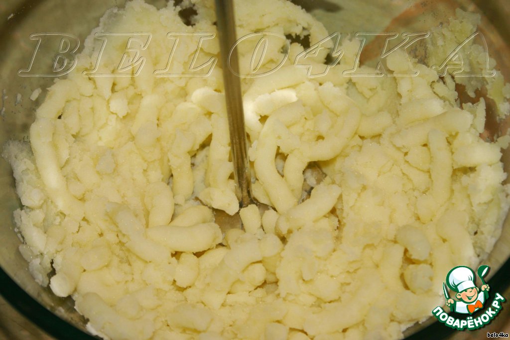 Смешиваем картофельное пюре с молоком, а потом с яйцами, мукой и солью.