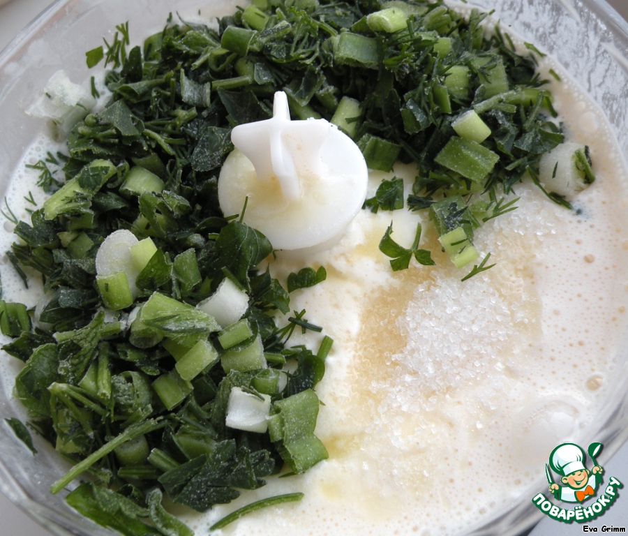 Добавим зелень, перемешаем на более низкой скорости, но не взбиваем, чтобы не измельчить ее сильно.