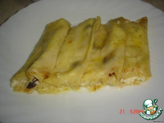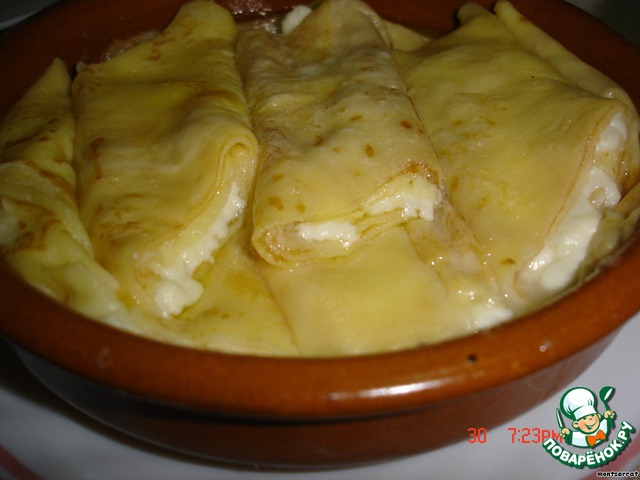 Посуду накрыть крышкой и поставить в духовку на 1 час при слабом нагреве. Налистники должны распариться, пропитаться сливочным маслом, но не пересохнуть.