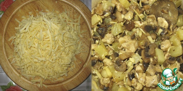 Натираем сыр на крупной тёрке. Добавляем сыр и ананасы к начинке, перемешиваем. Начинаем разогревать духовку до 180°.