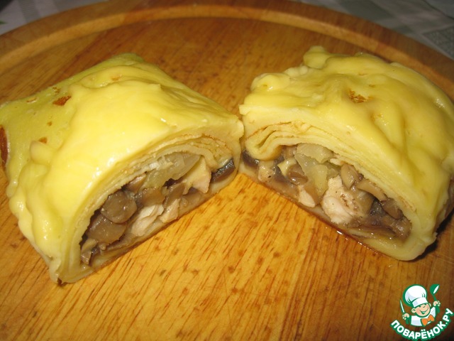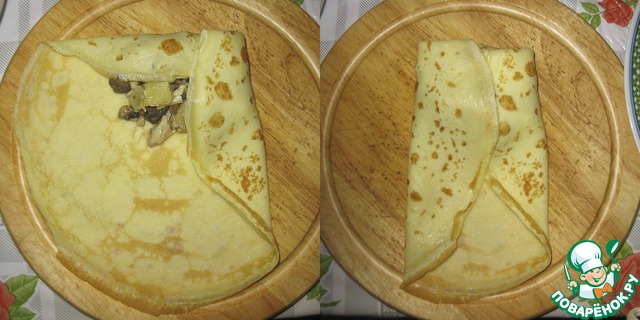 | Идея приготовления этих блинчиков пришла, когда вечером нужно было выбрать основное блюдо для праздничного стола, который наметился уже в первой половине следующего дня. Времени на приготовление практически не оставалось. А хотелось чего-то горячего, сытного, из любимых ингредиентов. Такого, что было бы похоже на жульен, но готовилось быстрее. И такого, что напоминало бы мясо по-французски, но удобнее делилось на порции. В результате получилось простое, быстрое, по-настоящему универсальное блюдо. А самое главное - гости оценили по высшему баллу: и в первый раз, и добавку:) |