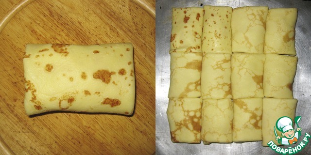 А так выглядят конверты в разрезе: всё красиво держится, нарезается ровно. Подаются блинчики горячими. Готовятся быстро, а исчезают ещё быстрее: уж очень вкусно:) Приятного аппетита!