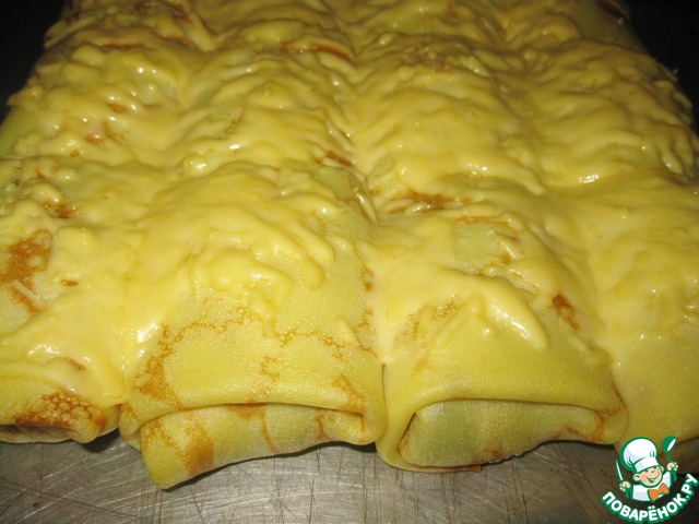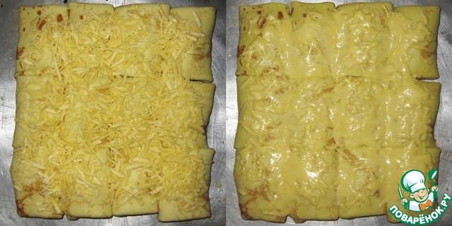 Посыпаем блинчики тёртым сыром и отправляем в духовку. Через 10 - 15 минут, когда полностью расплавится сыр, всё будет готово.