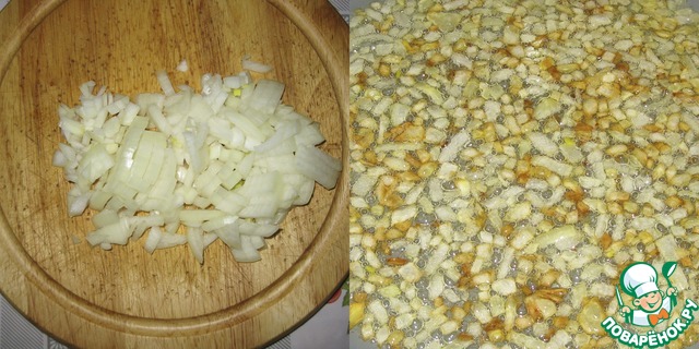 Нарезаем мелко лук и обжариваем в растительном масле до золотистого цвета.