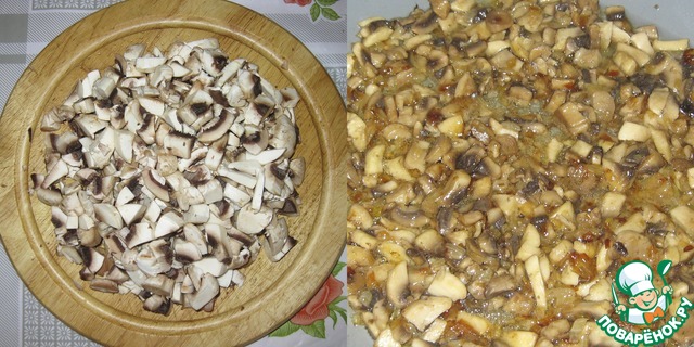 Мелко режем грибы, добавляем к луку, обжариваем.