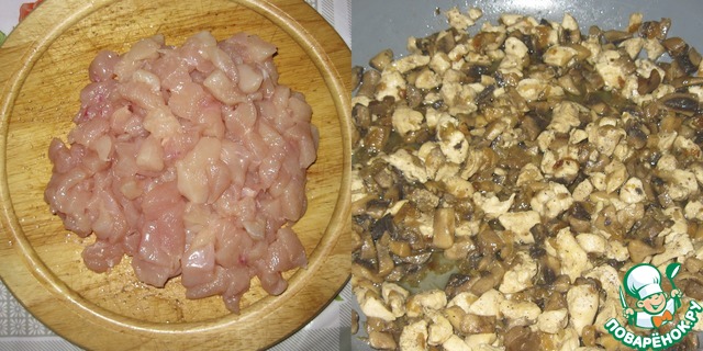 Куриное филе моем, обрезаем жир, плёнки, режем мелко и добавляем в сковороду к луку и грибам. Солим, перчим по вкусу. Держим на небольшом огне, помешивая, до обжаривания кусочков курицы. Выключаем, даём остыть. Всё, описанное выше, можно проделать, например, с вечера, и такую заготовку для начинки оставить в холодильнике. А закончить приготовление начинки и накрутить блинчики непосредственно перед приходом гостей.