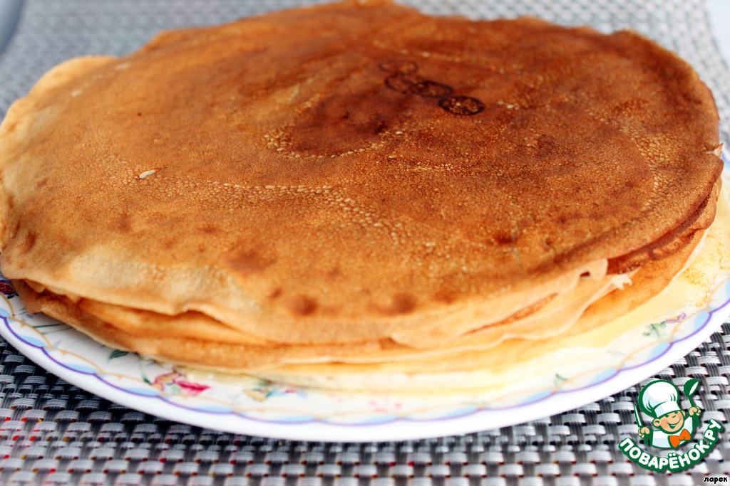 Испечь тонкие блинчики из тех ингредиентов, что указаны в рецепте. Из этого количества продуктов получилось 13 блинчиков диаметром 20 см. Можете испечь блины по своему любимому рецепту - это не принципиально. Для любителей сладкого в тесто можно добавить одну-две столовые ложки сахара. Я не добавляла.