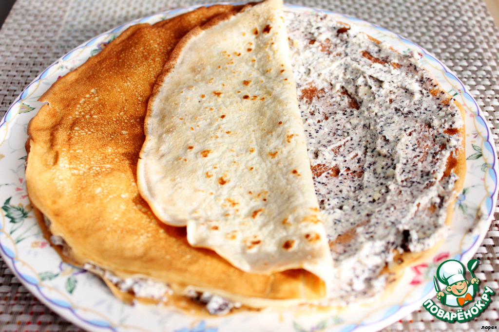 | Встречаем Масленицу во всеоружии! Очень вкусный блинчатый торт с прослойкой из творога, мака, сливок и белого шоколада. Рецепт этого блюда был размещeн на сайте в 2008 году пользователем lutsa под названием "Торт "Емеля" и иллюстрирован мной в рамках акции "Раскраски". |