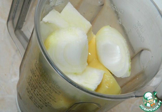 Взбиваем в блендере очищенный картофель, чеснок и лук до состояния пюре (чтобы лучше взбивалось можно подлить немного молока).