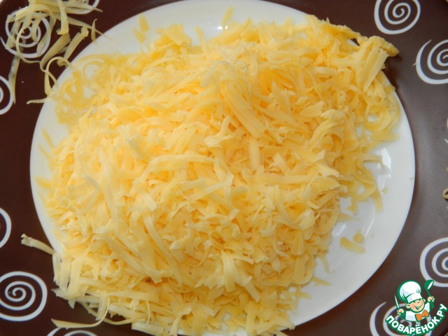 Сыр натираем на терке и высыпаем в тесто. Добавляем муку, молоко, воду, масло, соль.