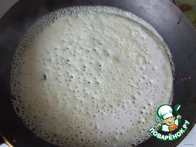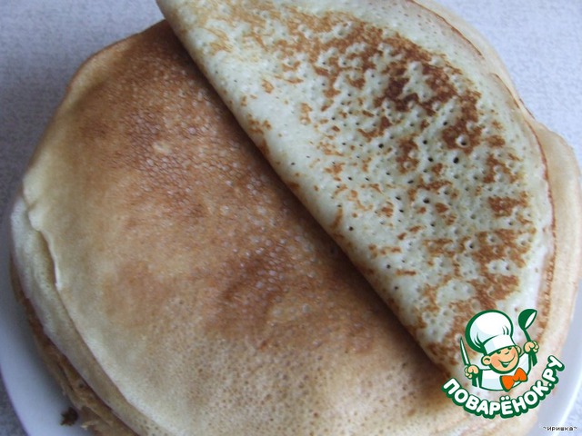 И выпекаем тоненькие блинчики, переворачивая их лопаткой.
