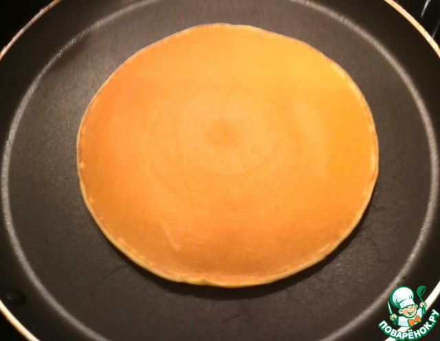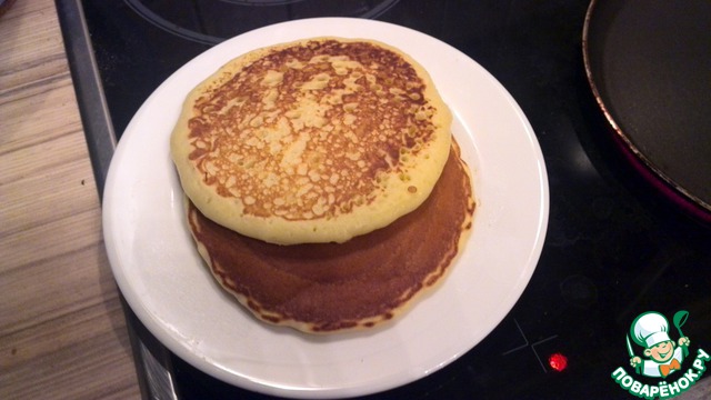Выливать небольшие порции теста на сковороду. Я пекла на блинной сковороде без масла. (если блинчики пристают слегка смазать маслом.) Печь каждый панкейк примерно по 1-2 минуте с каждой стороны. Но всё зависит от вашей плиты.