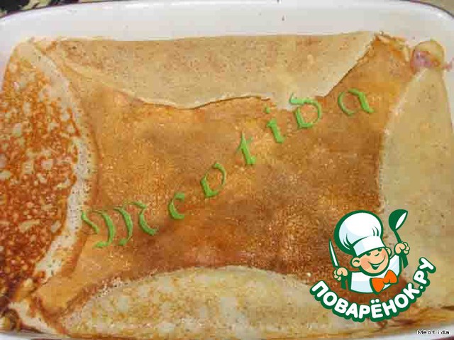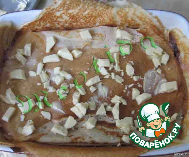 форму для выпекания (у меня форма размерами 15х23см) смазываем маслом , выкладываем блинчики внахлест, так чтобы края свешивались за бортик, на дно кладем 2-3 блинчика (один на другой)