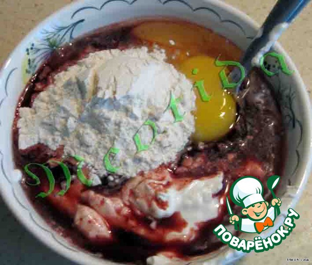 смешиваем вилочкой яйцо, муку (2ст.л.), сметанку, вишневый сок и немного ванилинчика для аромата