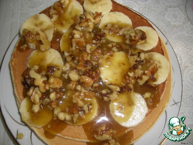 | Это вкусное блюдо открыл для меня один хороший человек, который приехал из Америки покорять Сибирь. И вот, спустя несколько лет захотелось мне вновь насладиться этим вкуснейшим десертом. Подбирала нужное количество ингредиентов и .... получилось!!! Нежный блинчик, тающий во рту, в сочетании со свежим бананом, хрустящими орешками и сладким мeдом. Правда, в том варианте был не мeд, а кленовый сироп (невероятный запах и вкус, кто пробовал - тот поймeт). Пробуйте! |