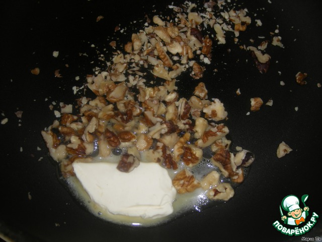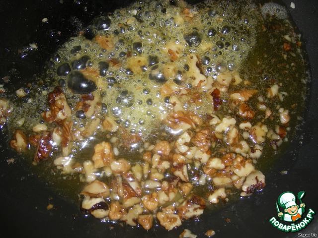 Грецкие орехи режем на несколько частей, слегка обжариваем на масле.