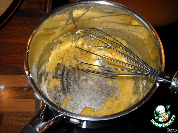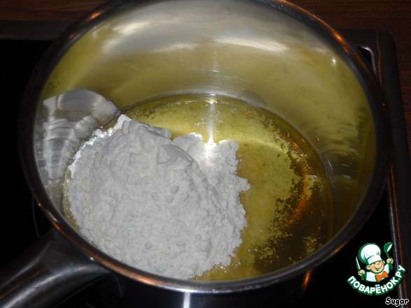 Готовим соус "морнэ" - это тот же соус "бешамель", только с добавлением сыра. В кастрюле растапливаем масло, добавляем муку.