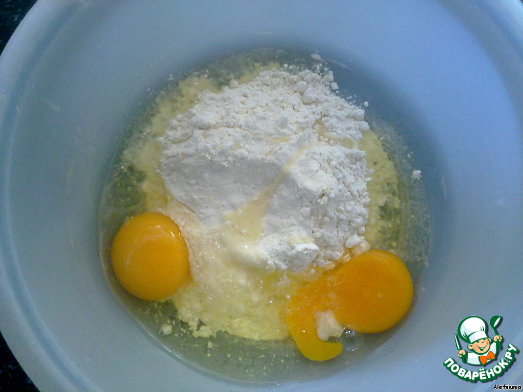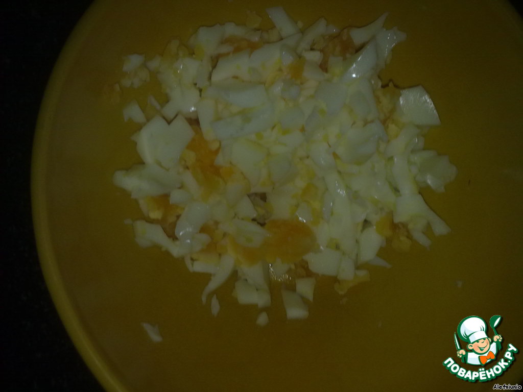 В муку добавить 2 яйца, соль и сахар. Еще 2 яйца отвариваем вкрутую и остужаем.