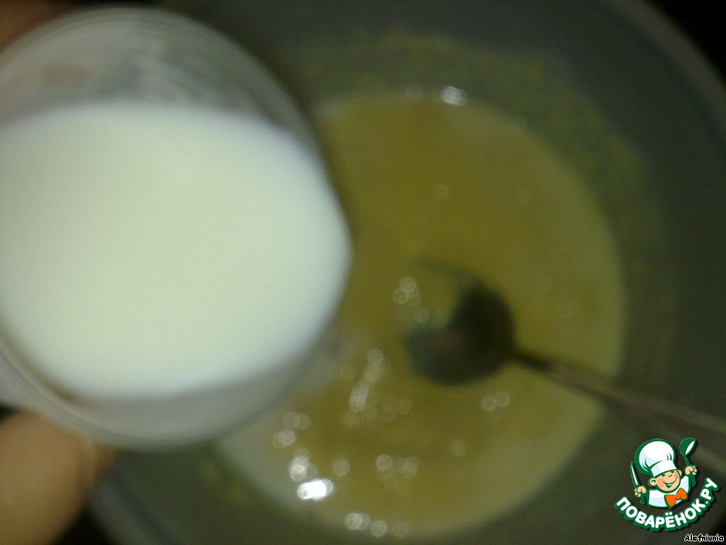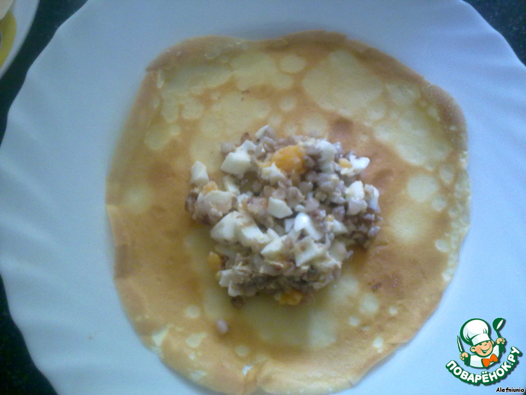Потихоньку помешивая, добавляем молоко, чтобы не было комочков. Выпекаем 8-10 тонких, небольших блинов с одной стороны.