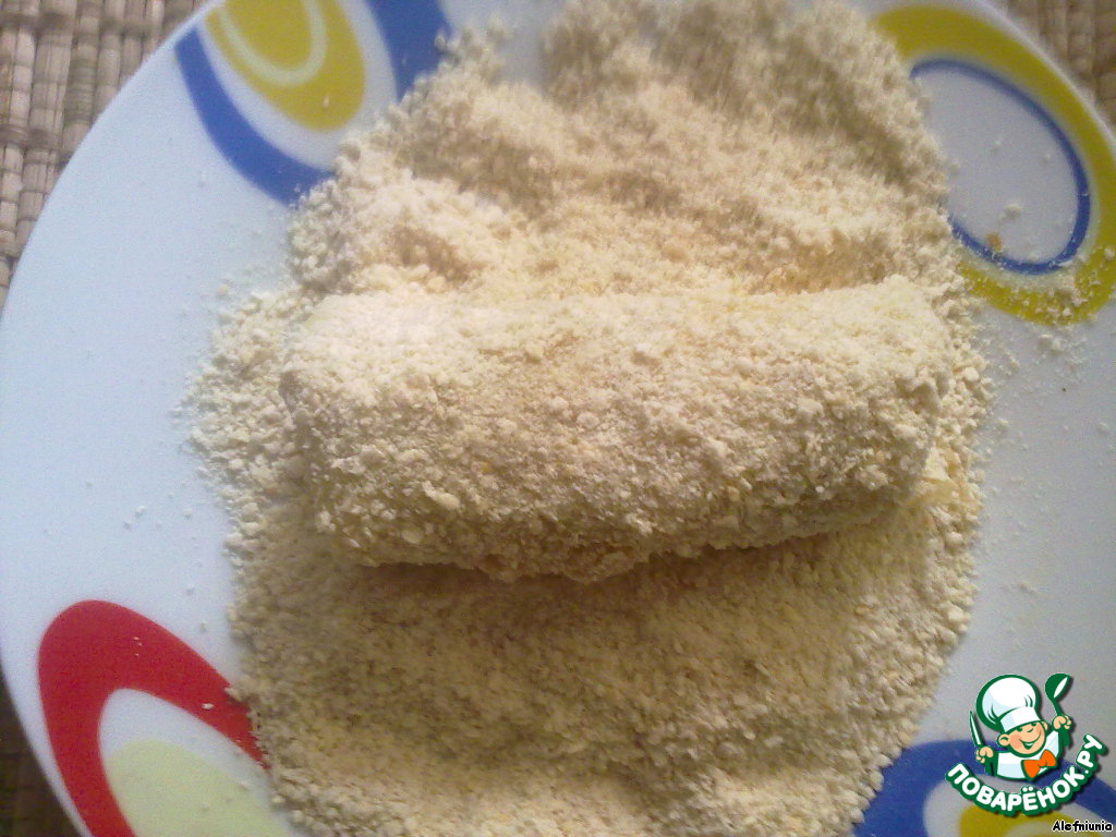1 Яйцо взбиваем с солью, отдельно на тарелку кладем сухари. Сперва обмакиваем блины в яйцо.