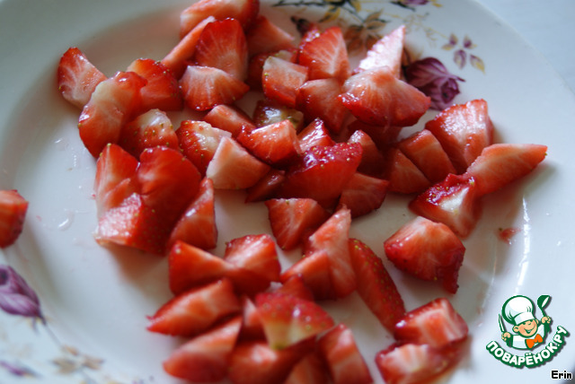 Режем на мелкие кусочки клубнику. Три самые красивые ягоды оставляем для украшения.