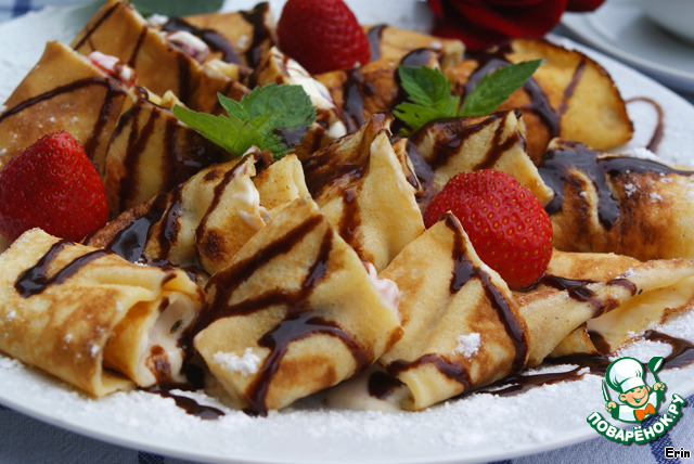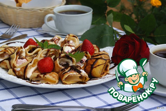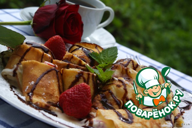 | ... Однажды во Франции, а точнее в Париже, два влюбленных повара (он - шеф, она - су-шеф) решили в свой выходной приготовить роматический ужин. Ничего сытного есть не хотелось, и они решили испечь блинчики... Оказалось, продуктов не очень много (немало времени и сил они тратили на работе, питались там же, дома совсем не готовили). Открыв холодильник, они нашли яйца, молоко, сливочное масло и, как чудо, остатки маскарпоне и горсть ягод клубники... Как любые повара, они искусно придумали блюдо... ... Красиво украсив свой десерт, они накрыли на балконе стол, налили кофе... и, блаженно закрыв глаза, попробовали кусочек... |