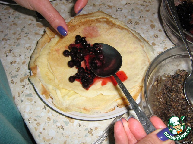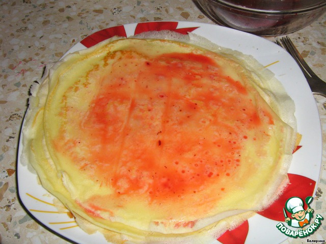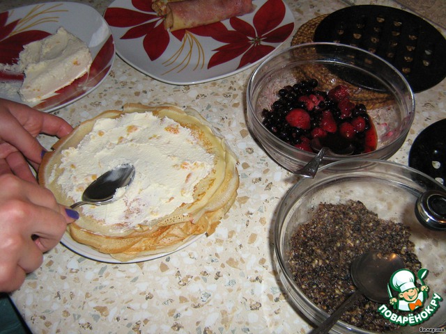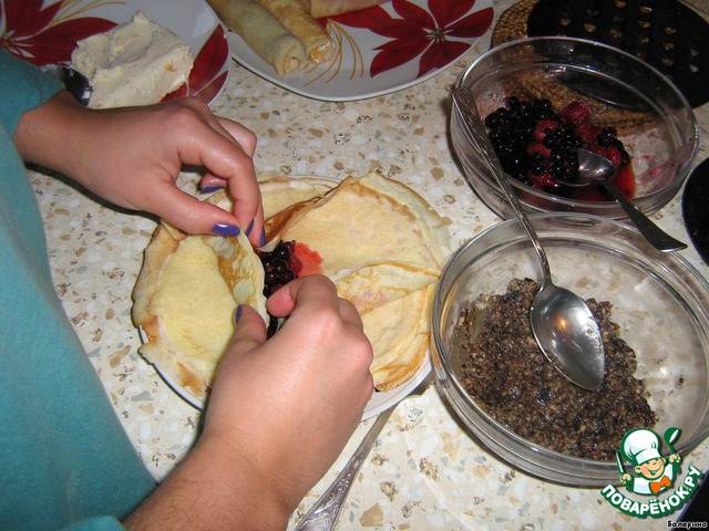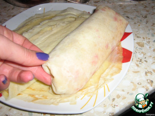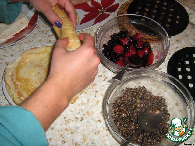 Выкладываем все 3 разных маленьких блинчика с начинкой на большой и плотно его закручиваем.