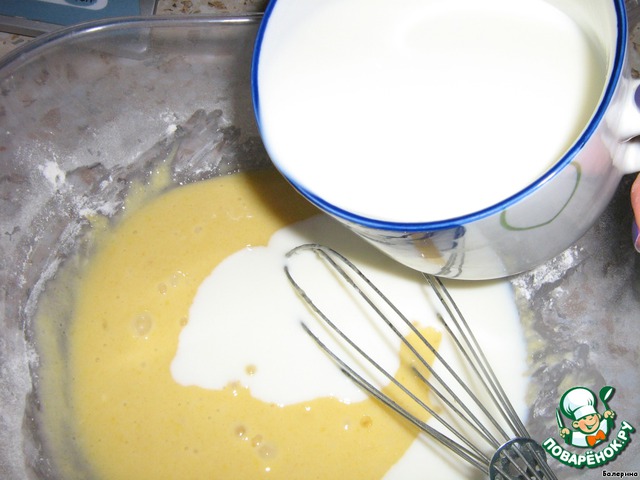 Далее мелкими порциями вливаем тепленькое молоко и тщательно размешиваем.