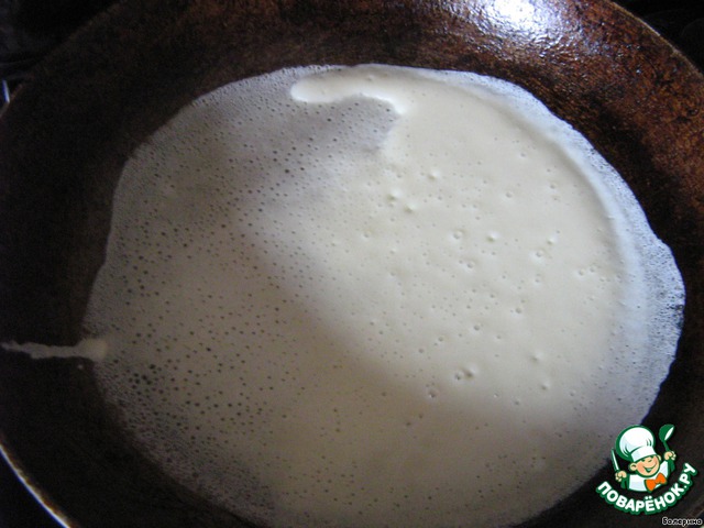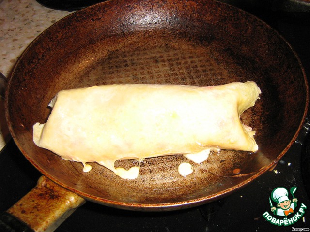 Обволакиваем наш гигантский тройной блин в яйцах и жарим до корочки на сковородке с растительным маслом.